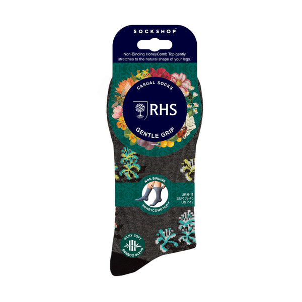 Our Mens Gentle Grip RHS Socks in Floral design are part of our collaboration with the Royal Horticultural Society, inspired by the RHS Lindley Collections, the world’s finest collection of botanical art. These socks feature floral designs on a selection of black, charcoal and grey socks.