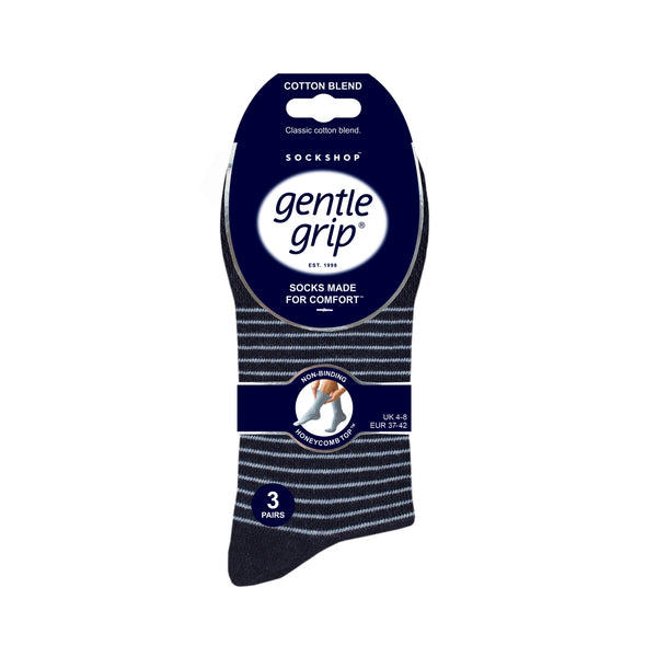 Unsere Gentle Grip Varsity Feinstreifen-Baumwollsocken in Denim/Navy-Design sind die ideale Lösung für alle, die normale Socken eng und unbequem finden. Diese bequemen Socken bestechen durch ihr schlichtes, aber auffälliges Design mit feinen Streifen in Himmelblau und Navy. Perfekt zu Jeans.