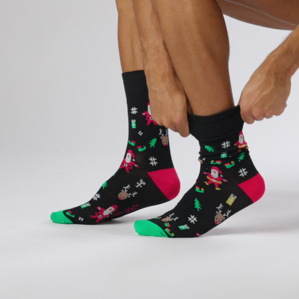 Unsere Gentle Grip Fun Feet Weihnachtssocken aus Baumwolle für Herren im Stechpalmen-/Baum-/Weihnachtsmann-Design sind die ideale Lösung für alle, die normale Socken eng und unbequem finden. Diese bequemen Socken zeigen Bäume, Weihnachtsmänner, Elfenschuhe und Geschenke in Schwarz, Tannengrün und Rot – perfekt für die Weihnachtszeit.