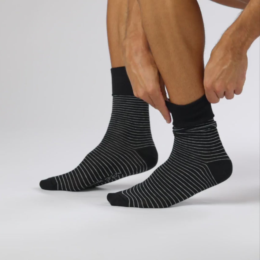 Unsere Gentle Grip Nova Fine Stripe Baumwollsocken für Herren in Schwarz sind die Lösung Nummer eins für Menschen, die normale Socken eng und unbequem finden.